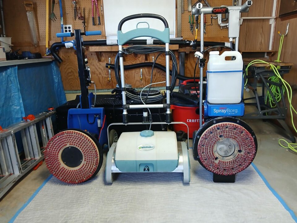 20'' Whittaker Trio is a 3 Brush CRB with a Sprayer. It's the best CRB for CGD. 75 pounds plus water weight on top of 3 brushes that sprays a fine mist in front of the 3 Brushes. It's an excellent scrubber and FAST