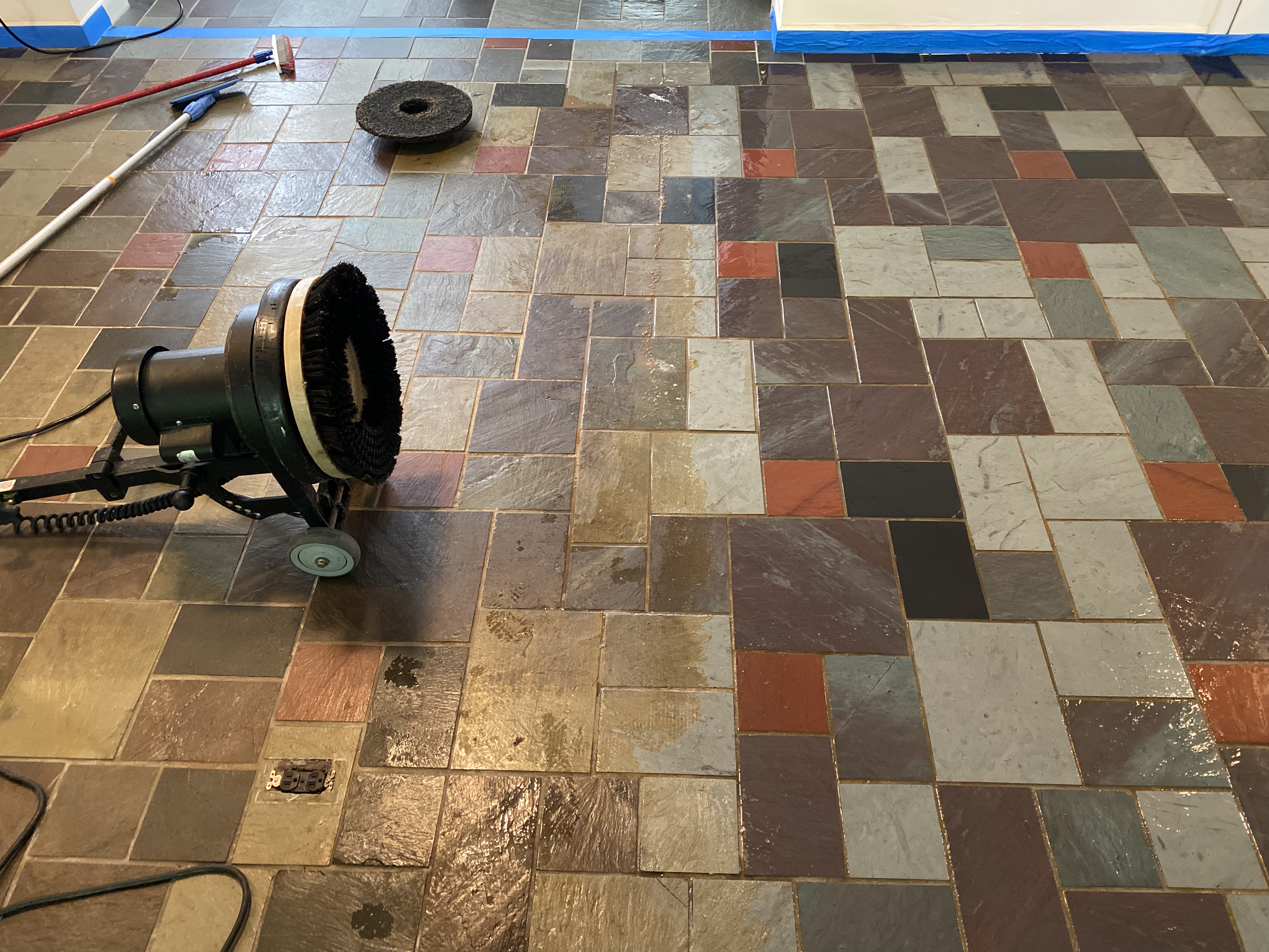 I stripped it twice with 30 minute dwell times. Some grout has some wax and it is yellow in various spots.